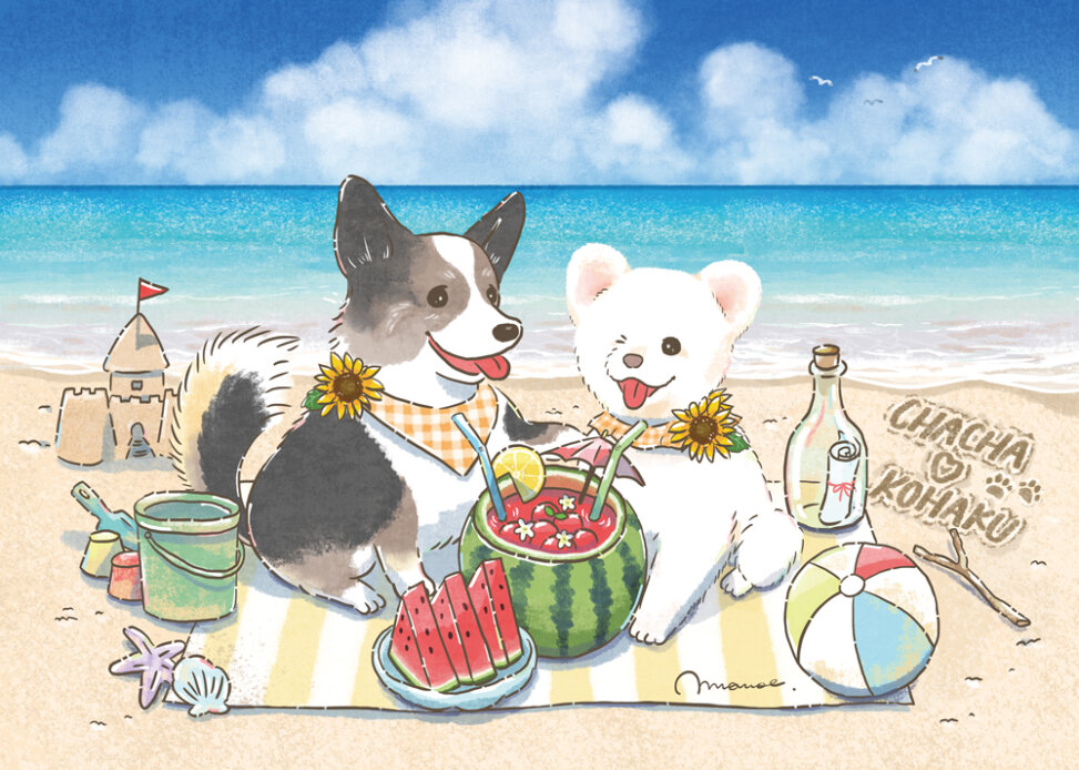 コーギーとパピヨンのミックスのチャチャくんとポメラニアンの女の子琥珀ちゃんが初めての海水浴に来た様子を描きました。砂遊びや貝探しを楽しんだ後は大好きなスイカとスイカジュースの時間です。二人が今日一緒に海に来たことをずっと忘れないようにと、浜辺に名前を刻み、手形を押しました。二人はお手紙を書いてそれをボトルに詰め海に流すつもりのようです。一体二人は何を書いたのでしょう。チャチャくん自慢のふさふさのしっぽ、琥珀ちゃんの綿菓子のようなふわふわな毛並みを表現いたしました。今はお空にいるチャチャくん、きっと琥珀ちゃんとご家族のことを見守ってくれているでしょう。