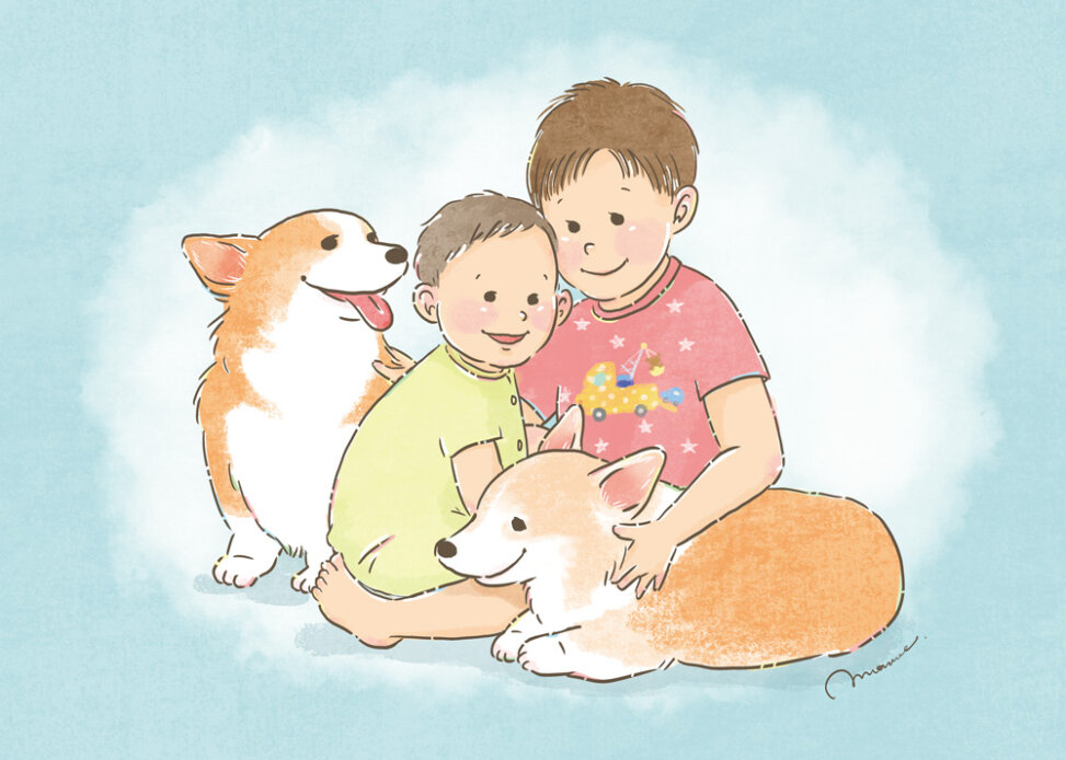 お母様から、コーギーのマリンちゃんとコロンくん、そしてご兄弟の似顔絵を描いて欲しいとのご依頼がありました。弟のはるき君が生まれて、ますますお兄さんらしくなったゆうま君と、いつもそばで二人の成長を温かく見守るマリンちゃんとコロンくん。4人が作り出す空気はとても優しく見ている人を癒してくれます。これからも兄弟仲良く、すくすくと元気に成長してほしいというお母様の思いを受け、描かせていただきました。
