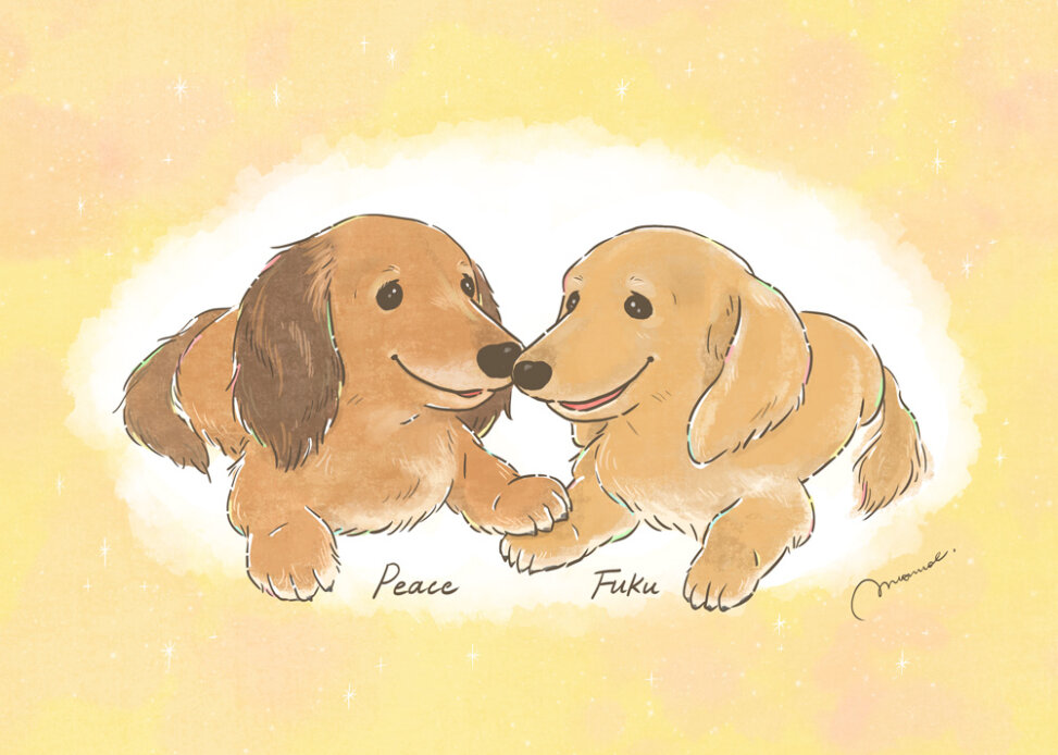 ご依頼者様から、天国にいる先代のダックスフンドピースちゃんと、新入りの福ちゃんが初対面しているイラストを描いて欲しいというご要望をいただきました。ピースちゃんが福ちゃんに、「これからも家族のみんなをよろしくね、君もたくさん可愛がってもらって、みんなのこともたくさん幸せにするんだよ」と話してくれています。福ちゃんも、ピースちゃんから託された思いをしっかりと受け止めているようです。これからもご依頼者様のご家族がピースちゃんがいた時のように、福ちゃんとも幸せな時間を過ごすことができますようにという願いを込め描かせていただきました。